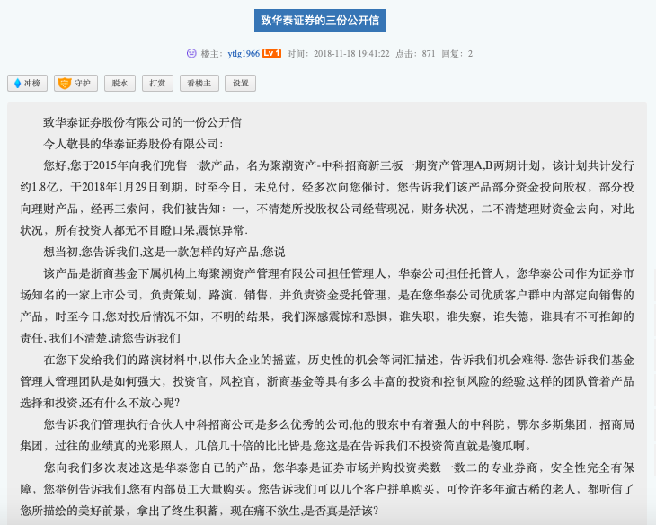 另有投资者在帖子中指责华泰证券,称在多次催讨后,被公司告知“不清楚所投股权公司经营现况,财务状况,二不清楚理财资金去向,对此状况”,同时指出华泰证券在销售该产品时,存在夸大宣传的情况。