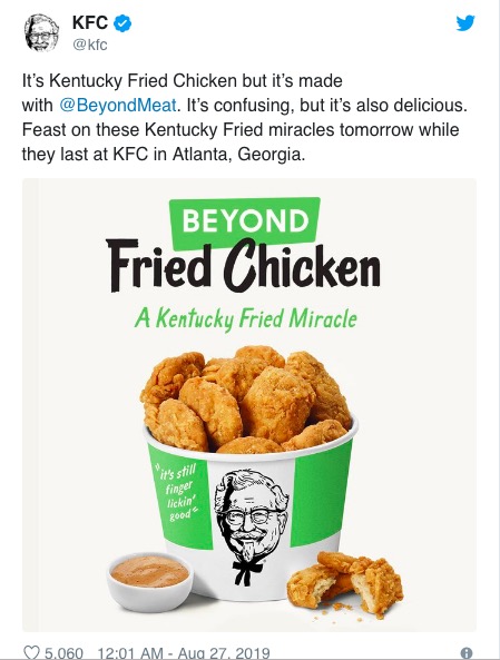 “这是肯德基,也是Beyond Meat人造肉。听上去有点让你困惑?但它很美味。明天快来乔治亚州亚特兰大的肯德基餐厅享受美味吧。”8月26号,肯德基在社交媒体Twitter上写道,并配上了一张绿色包装的炸鸡桶照片。
