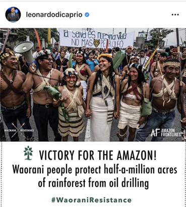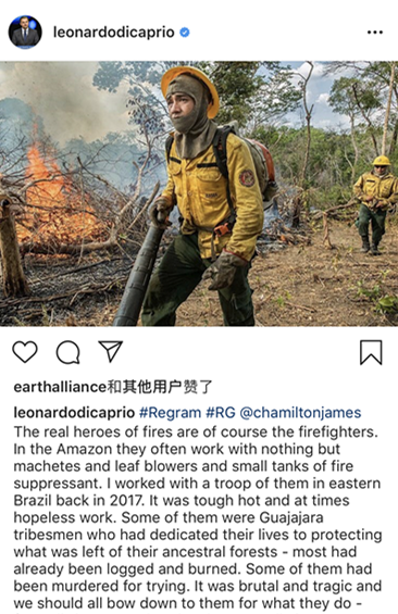 亚马孙雨林和与之生死相依的原住民的命运是迪卡普里奥最为关心的话题之一。在他的Instagram账号上几乎全部都是关于保护亚马孙雨林和原住民的内容。不仅如此,迪卡普里奥还在本周一呼吁人们对原住民消防队员给予特别关注。
