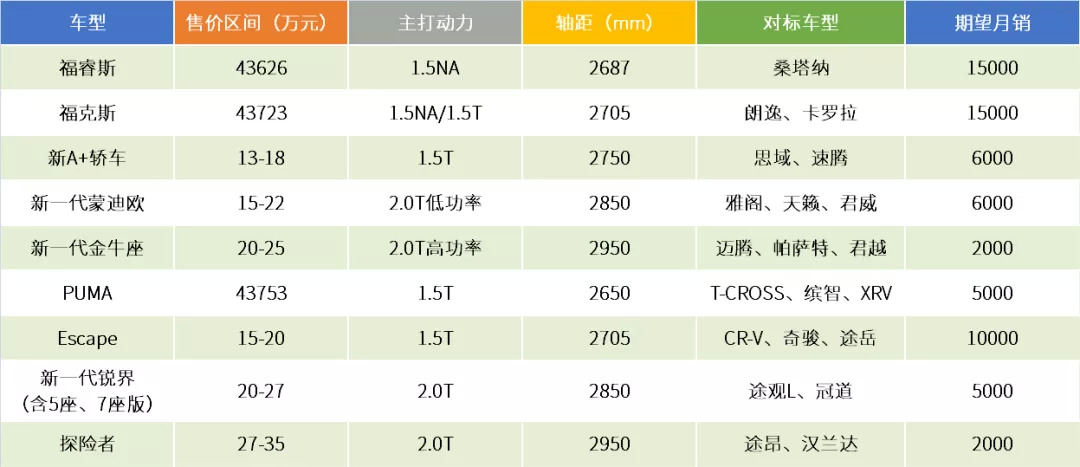 3.产品线需要进行彻底的定位重构,翼搏、翼虎、领界这些老车型都应该停产或者作为细分市场补充车型,而不是投入大量资源在这些车型之上,把有限的资源投入到PUMA、Escape、探险者这些即将上市的新车型上,另外,蒙迪欧、锐界、金牛座换代也刻不容缓。