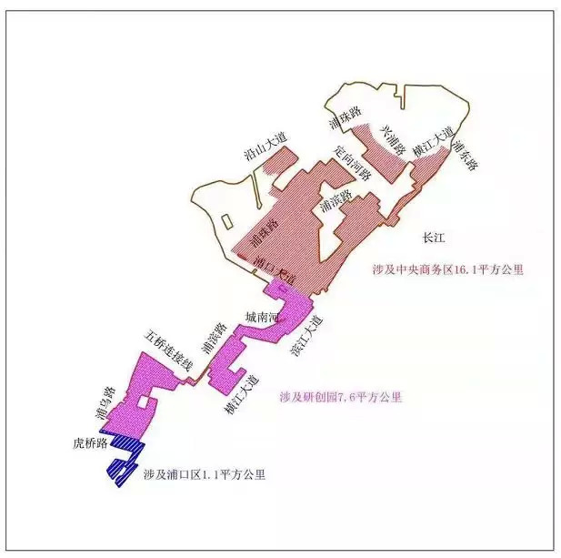 四至范围:东至长江、横江大道、浦滨路,南至虎桥路、西江路,西至环山路、沿山大道、浦乌路,北至锦绣路、凯天路、浦东路。