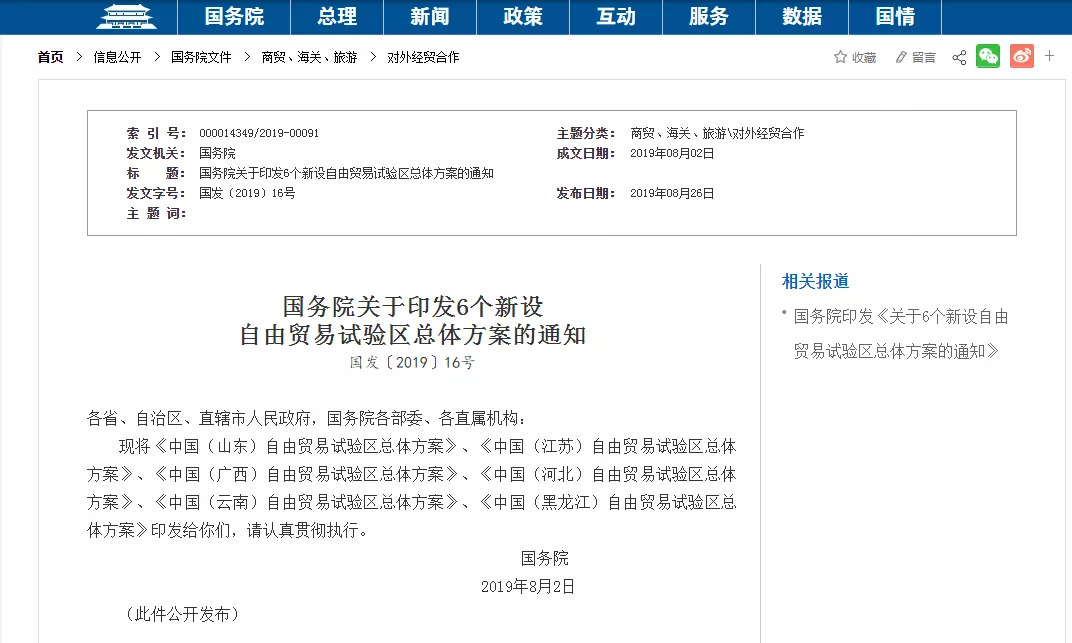 日前,国务院印发《中国(山东)、(江苏)、(广西)、(河北)、(云南)、(黑龙江)自由贸易试验区总体方案》。