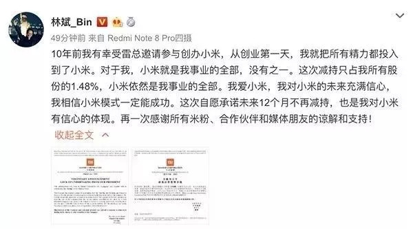 同日,林斌个人也在微博上晒出关于本次承诺的函件和公告。他表示,小米依然是我事业的全部。我爱小米,我对小米的未来充满信心,我相信小米模式一定能成功。