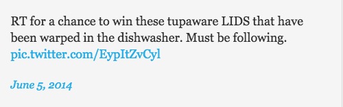 “转发就有机会抽中在洗碗机里被洗坏了的特百惠盖子。记得先关注我们哦。”