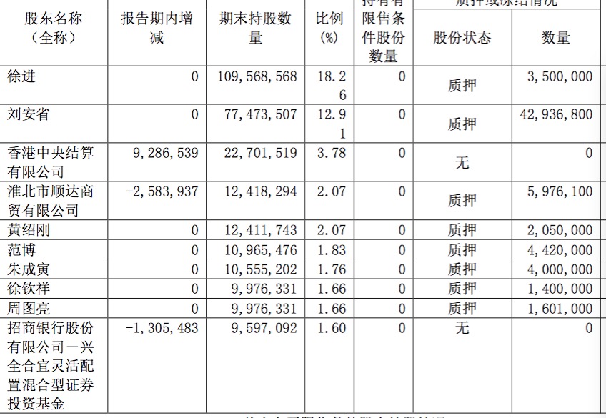 股权质押方面,公司第一大股东徐进持股1.1亿股,持股比例18.26%,质押350万股,质押比例较低,第二大股东刘安省持股7747.35万股,持股比例12.91%,质押4293.68万股,质押比例达55.42%。此外,第五-第九大股东都有不同比例的股权质押情况。