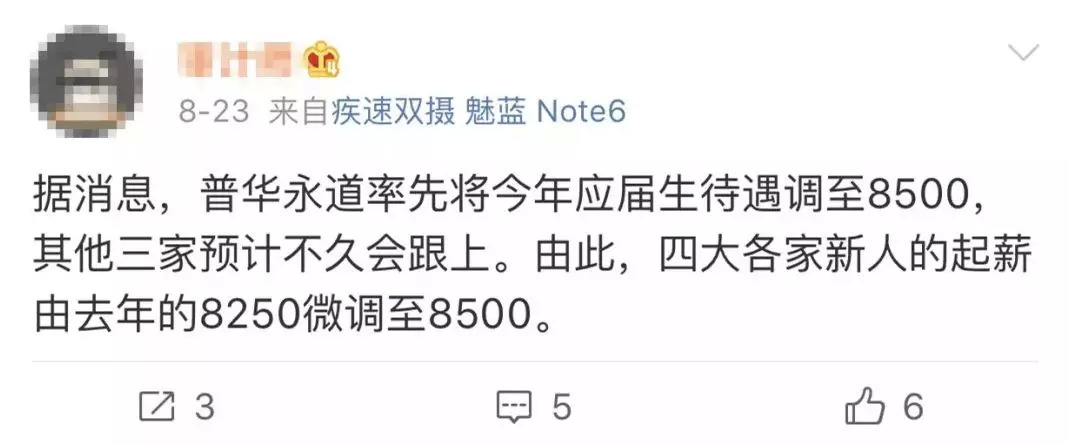 昨天上午,早于安永,在普华永道的北京群里就有消息传出,普华将今年入职员工的起薪调整至9000元每月: