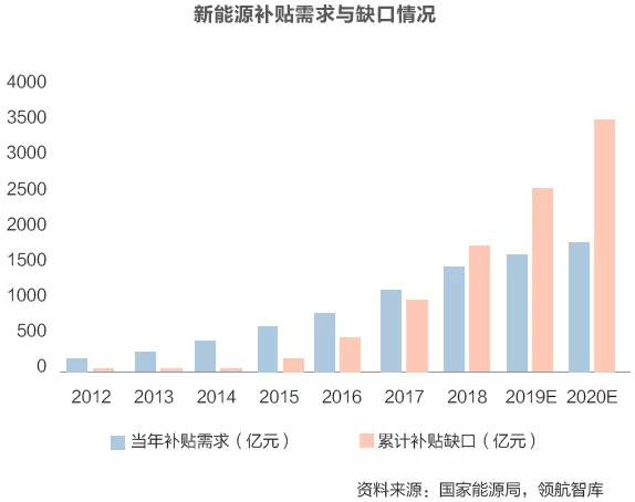 根据国家发改委能源研究所研究员王斯成的测算,截至2018年底,可再生能源补贴拖欠已经达到2000亿元人民币,不算2019年以后的新增补贴,20年后补贴全部退出,合计需约3万亿元补贴资金。