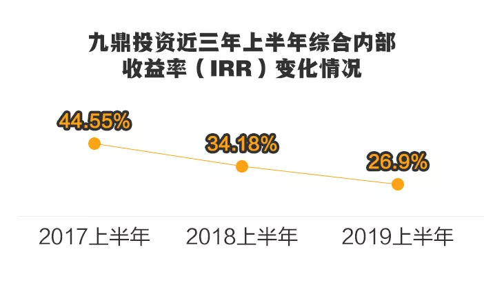 单就IRR这个指标来看,九鼎投资近三年的该指标都呈下滑态势。2017年上半年,其IRR还高达44.55%;2018年上半年净利润为亏损状态下,综合IRR也有34.18%;到今年上半年却下滑至26.9%。
