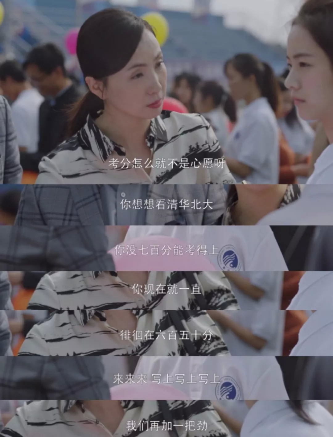 誓师大会上写梦想气球的环节,相较于方圆写的是“考上还是考不上,小小欢喜才是好”的佛系快乐,乔英子写下“中国国家航天局”的目标后,宋倩拿过气球,写了句“清华北大任选其一”,又强塞给英子,让她写“一定考上700分”。