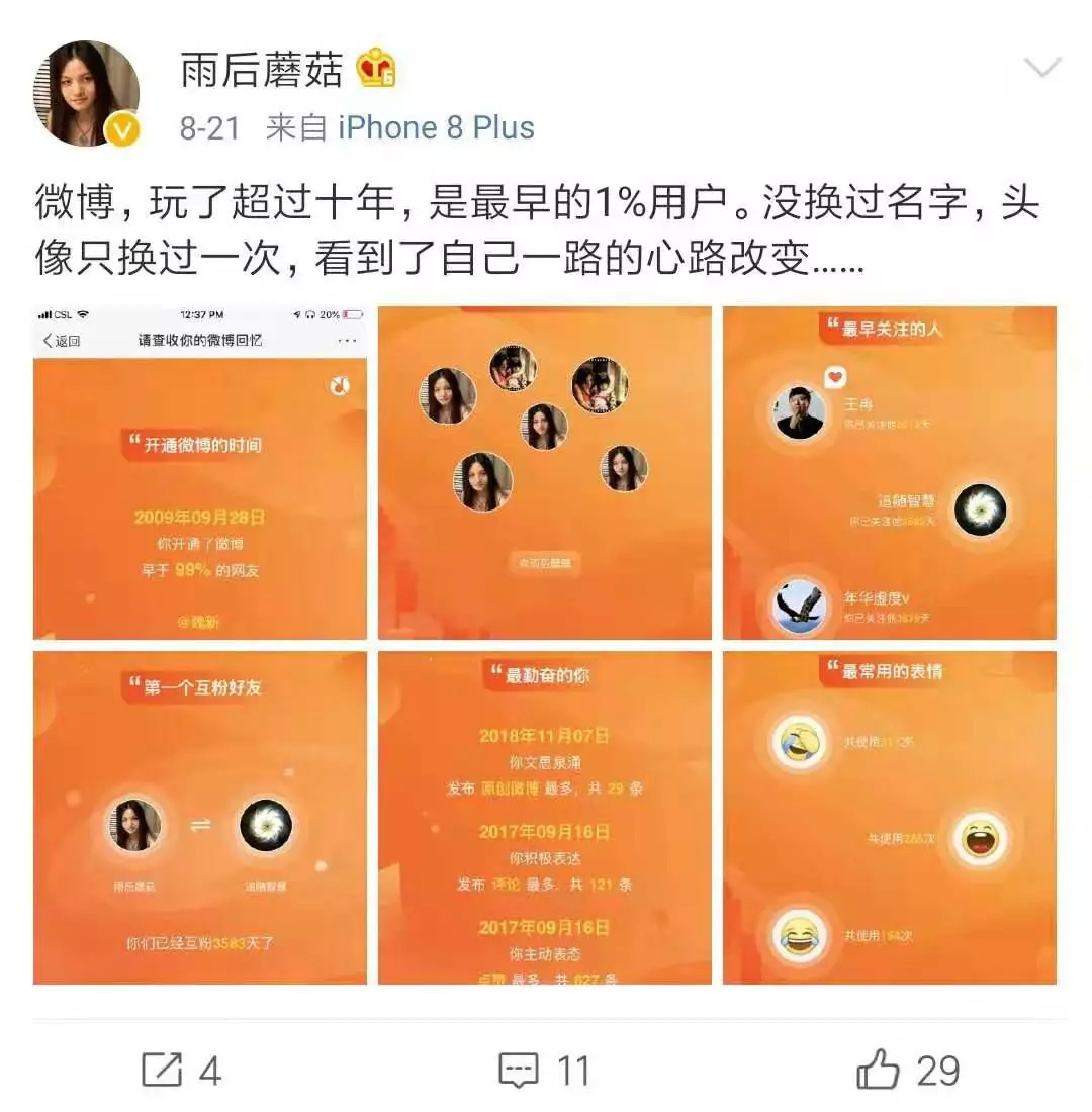 2009年9月28日,微博正式上线1个月,蘑菇就成为注册用户。那时她刚生完孩子,不久之后来到美国。语言不通,不认识人,微博成为她和国内沟通的桥梁。后来,她成为美国注册会计师,日常会用 Facebook 和当地人交流,但使用最多的还是微博。