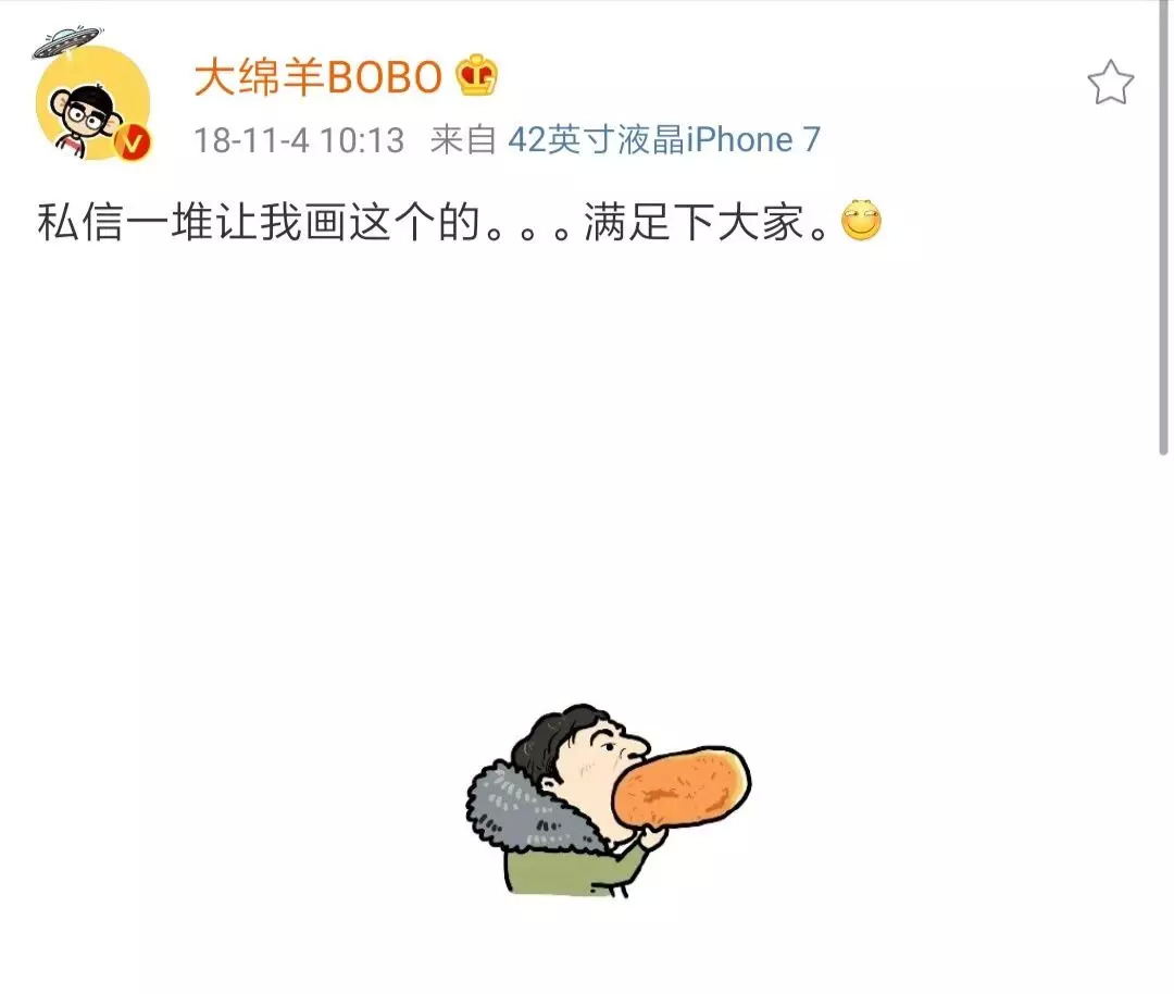 以前,楼氏签的都是幽默搞笑博主,今年这个比例会降到50%以下。比如公司旗下的@大绵羊BOBO,专门画卡通小头像。去年轰动全网的“王思聪吃面包”头像,就出自他手。BOBO团队还做了给爱豆画头像的活动,试图吸引更年轻的微博用户。