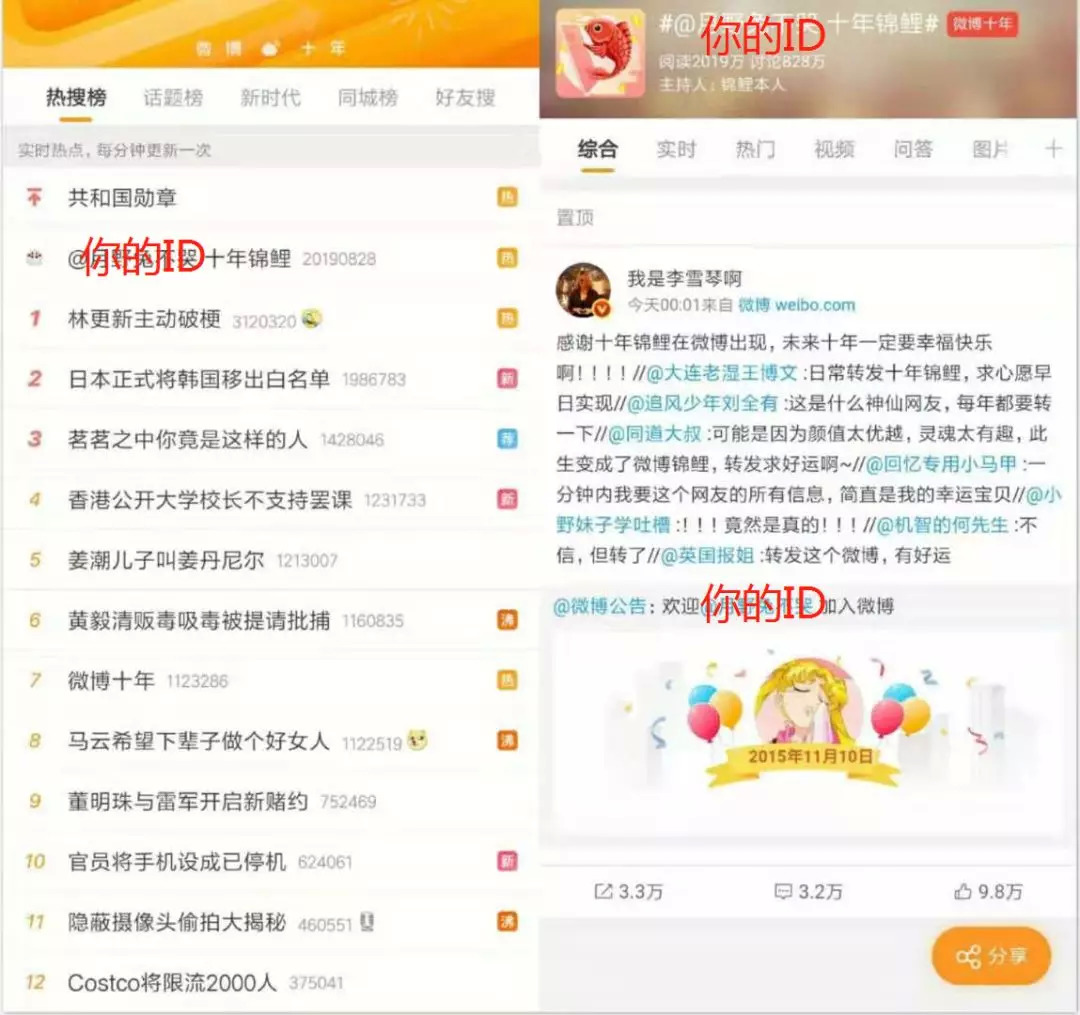 今天,微博为了庆祝十岁生日,还设置了开屏和热搜活动。热搜第一上方,会出现带有用户ID的假热搜,热度值为“20190828”。热搜内容随机生成,其中有个标题是#@xx(你的ID) 十年锦鲤。点开,会有一众大V转发祝贺你。