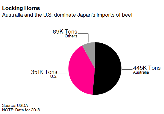 彭博社数据显示,2018年澳大利亚向日本出口牛肉44.5万吨,占其市场份额的51%,美国向日本出口牛肉35.1万吨,占41%,剩余部分被新西兰、加拿大和墨西哥瓜分。