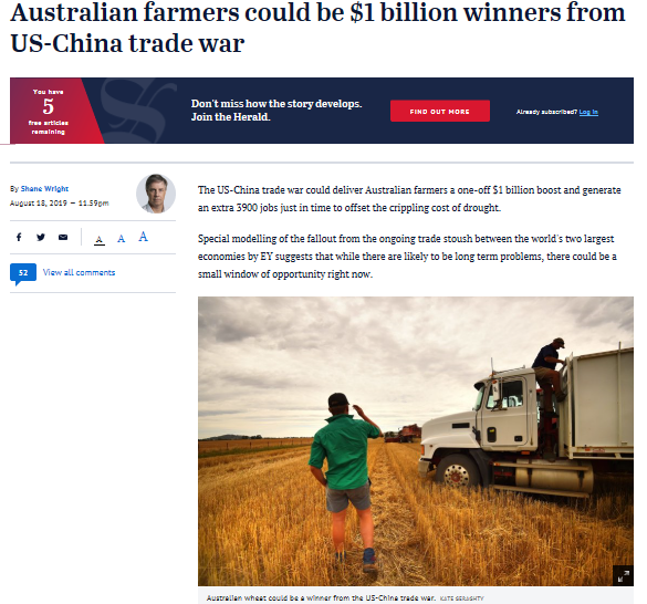 事实上,澳大利亚牛肉和美国牛肉在日本市场的争夺,只是澳美农业利益在全球竞争的缩影。8月18日,《悉尼前驱晨报》发表文章称,安永公司通过统计数据建模后得出,全球两个最大经济体贸易摩擦的意外结果是,澳大利亚农业可能因此受益10亿澳元,并创造3900个岗位。