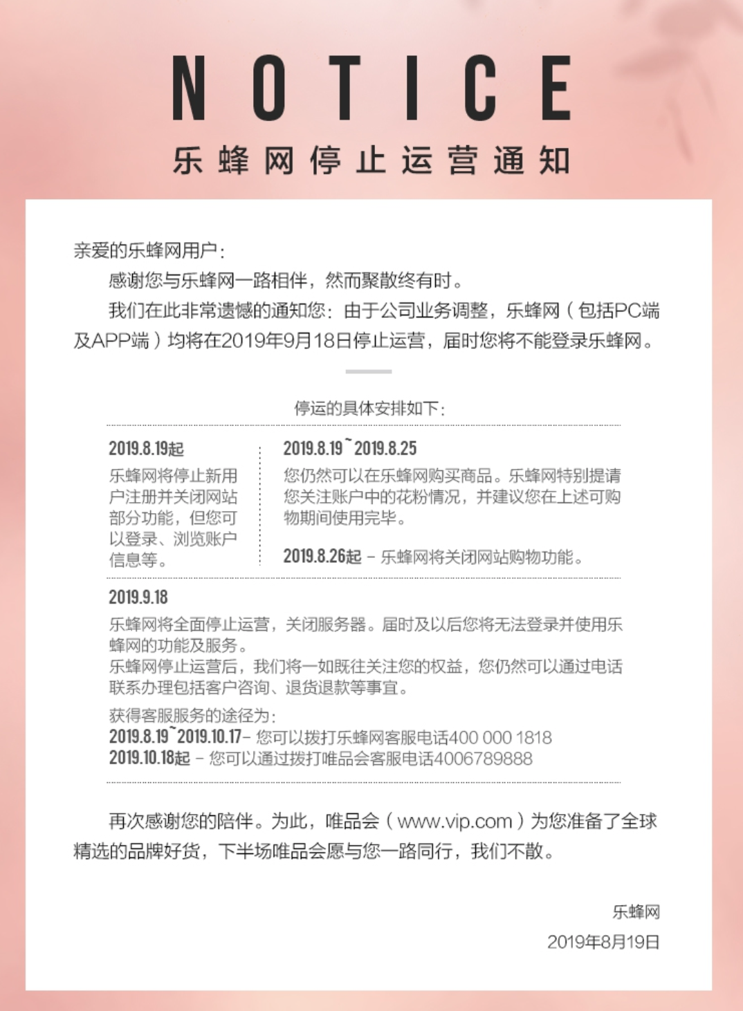 8月28日,唯品会旗下美妆电商乐蜂网通过微信公众号宣布将于9月18日正式停止运营。目前用户仍可在乐蜂网购买商品,8月26日该网站购物功能将关闭。