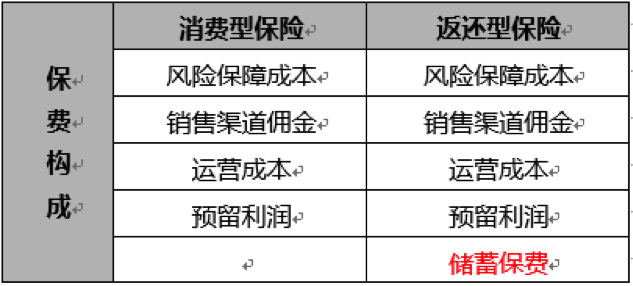 如果保障范围和保障期限一样,返还型保险会比消费型的保费高一些。之所以保费偏高,是因为它的保费成本里多了一项:储蓄保费。