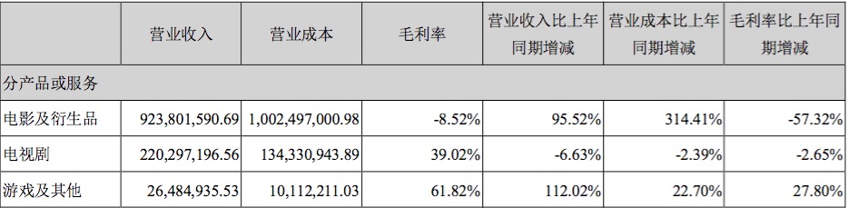 分产品来看,上半年,电影及衍生品实现营收9.238亿元,较上年同期增长95.52%,毛利率为-8.52%,较上年同期下滑57.32%;电视剧实现营收2.2亿元,较上年同期下滑6.63%,毛利率为39.02%,较上年同期下滑2.65%;游戏及其他实现营收2648.5万元,较上年同期增长112.02%,毛利率达到61.82%,较上年同期增长27.8%。