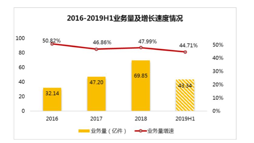 报告显示,韵达2019年上半年实现营业收入155.54亿元,同比增长163.51%。其中:快递服务业务收入142.83亿元,同比增长174.24%;单票快递业务收入3.30元,同比增加1.56元/票。