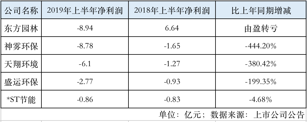 环保行业困难户陆续发布半年报,东方园林(002310.SZ)以近9亿亏损居于榜首。