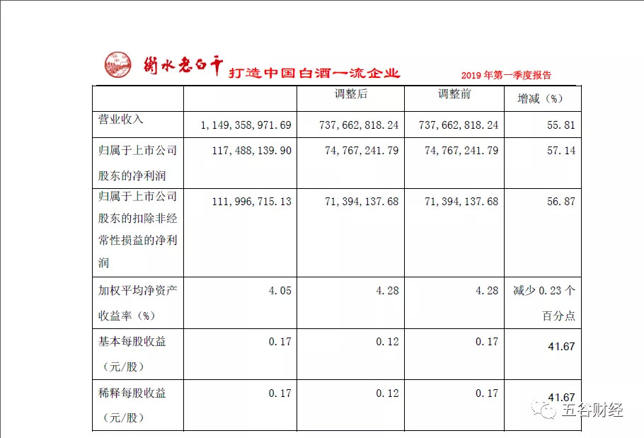 2019年第一季度,老白干酒实现营业收入约为11.49亿元,与去年同期7.38亿元,增幅在56%左右;归属于上市公司股东的净利润约为1.18亿元,和2018年第一季度0.75亿元相比,增幅在57%左右。