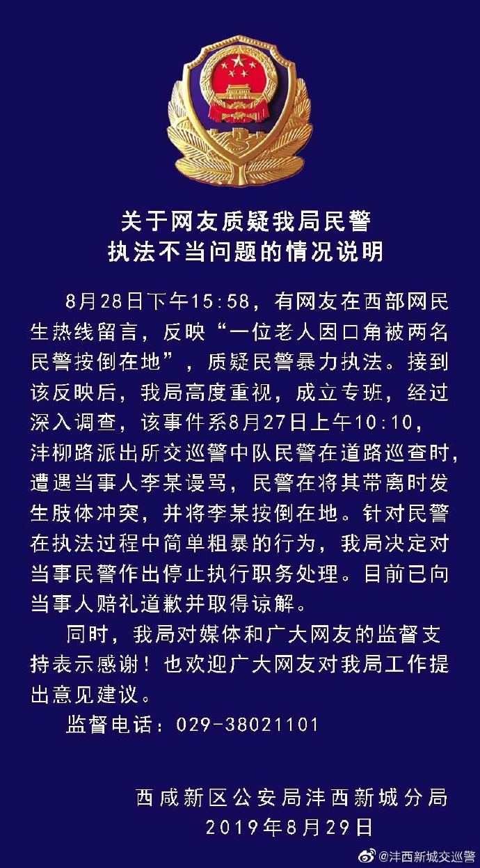 陕西西咸新区公安局沣西新城分局交通巡逻警察大队官方微博29日消息,针对有网友反映“一位老人因口角被两名民警按倒在地” ,质疑民警暴力执法一事,8月29日,陕西西咸新区公安局沣西新城分局交通巡逻警察大队官方微博发布情况说明称,该事件系8月27日上午10:10,沣柳路派出所交巡警中队民警在道路巡查时,遭遇当事人李某谩骂,民警在将其带离时发生肢体冲突, 并将李某按倒在地。
