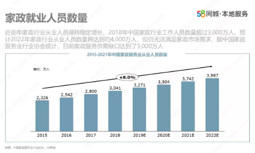 《家政服务行业报告》也对家政从业人员进行了群像刻画。据58同城数据显示,2018年,家政行业工作人数超过3000万人,预计到2022年这一人数将达到4000万人。不过,如此到的服务规模仍然无法满足市场需求,家政服务的供需缺口达到3000万人。