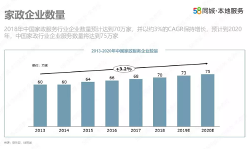 对家政服务企业,58同城也进行了精准刻画。《家政服务行业报告》显示,2018年,中国家政服务行业企业数量预计达到70万家,并以约3%的年复合增长率发展,预计到2020年,中国家政行业企业服务数量将达到75万家。可见,巨大的市场需求推动更多企业参与行业服务。