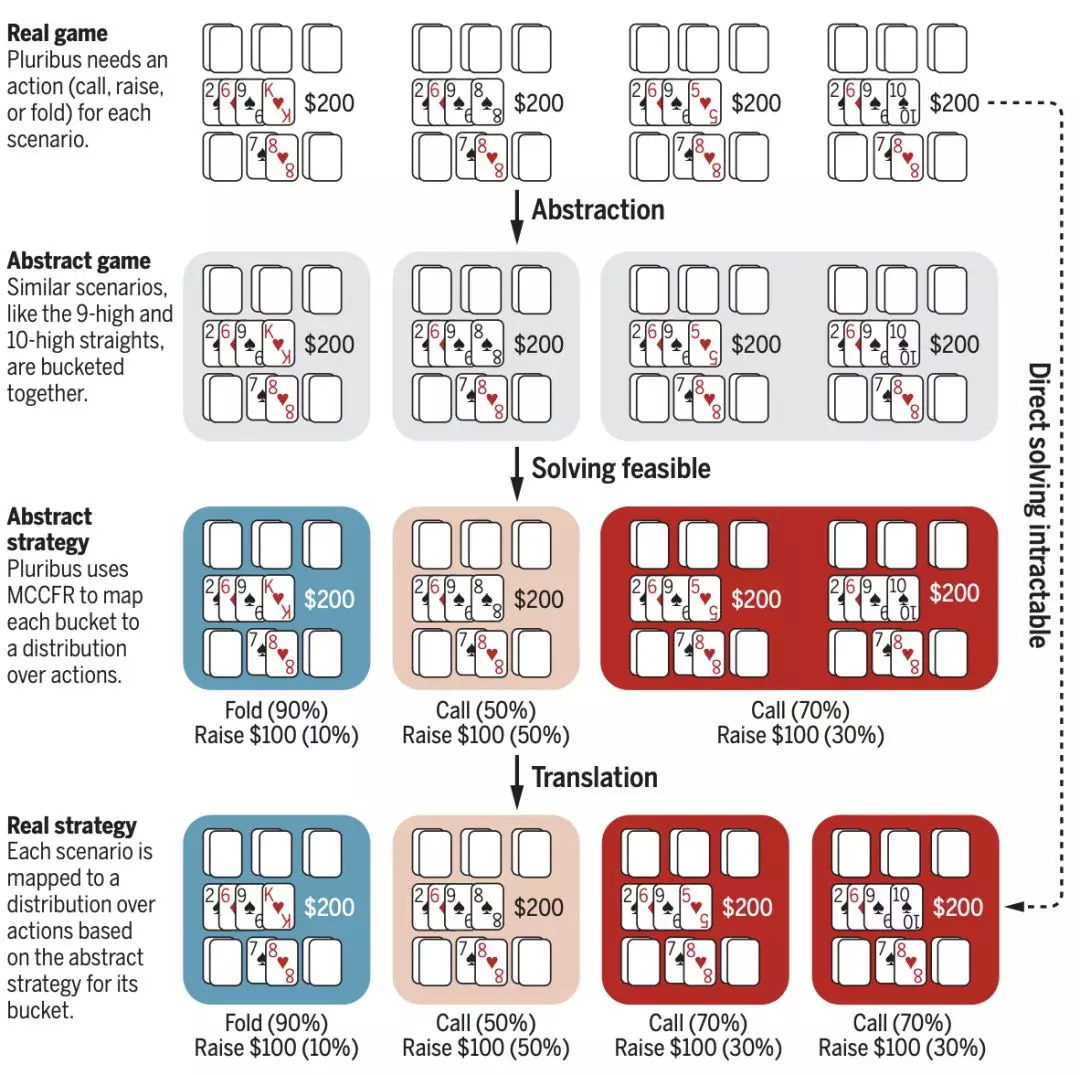 在Abstraction机制中,Pluribus通过将类似的情况打包在一起,减少了关于是否跟注(call)、加注(raise)或弃牌(fold)的决策点的数量。使用蒙特卡罗虚拟遗憾最小化(MCCFR),将扑克游戏中树搜索的复杂性从一个棘手的问题降低到一个可解决的问题。