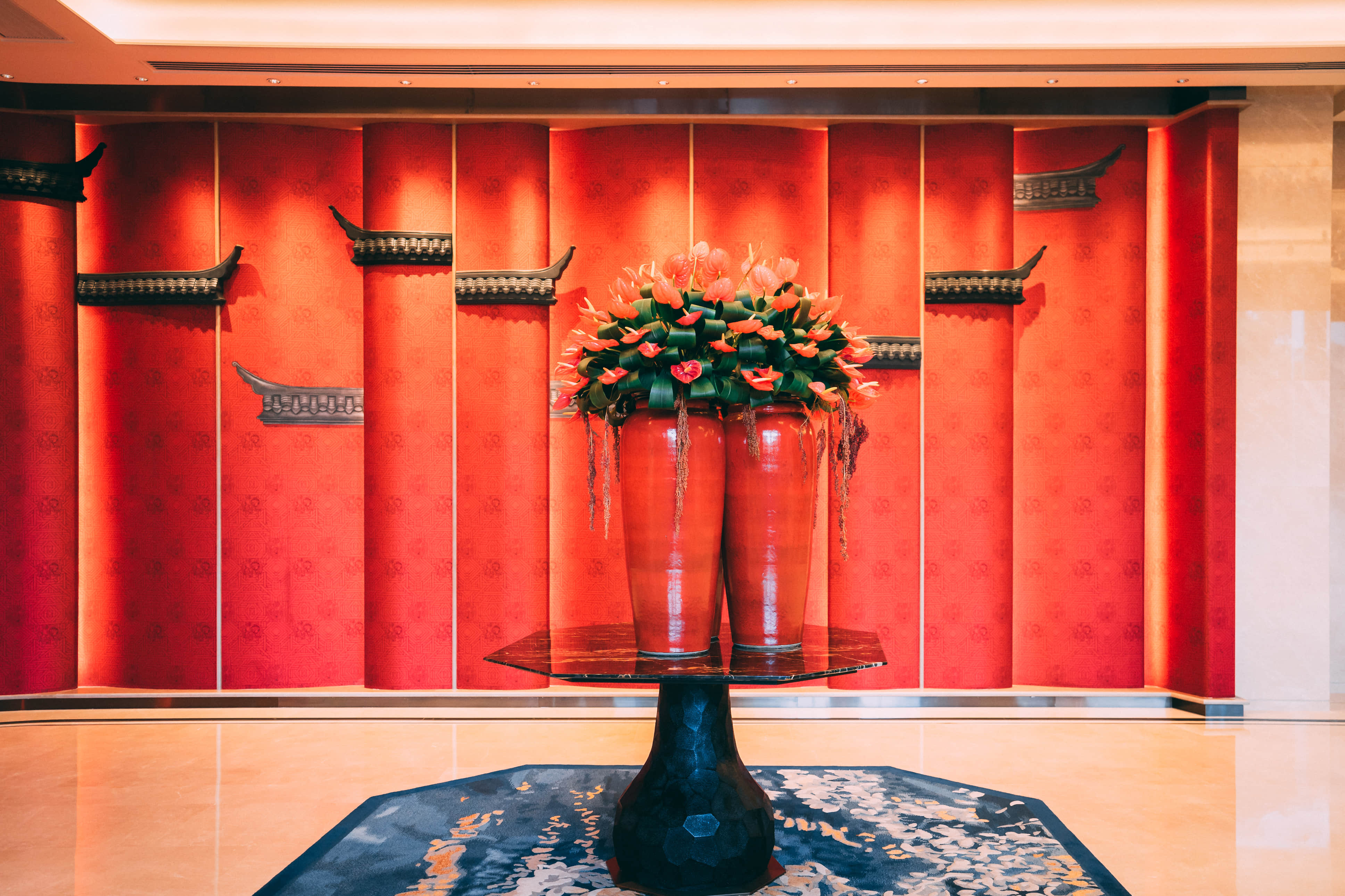 比如苏州传统粉墙黛瓦元素与红色丝绸结合一面墙壁,配色鲜明、出挑,又融入了苏州的传统风格。几乎成为了苏州园区香格里拉大酒店的代表,让人可以一眼认出这家全新的酒店。