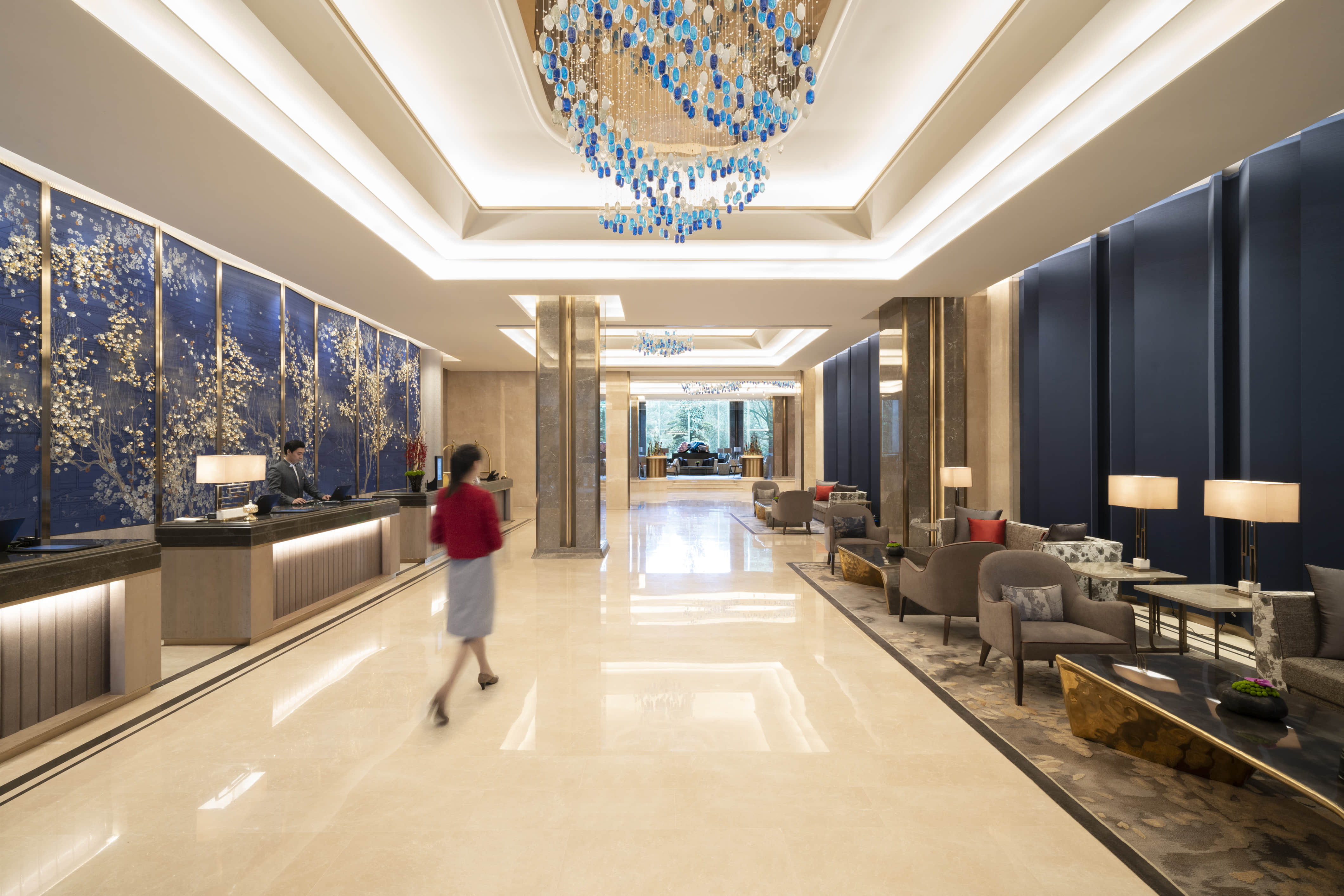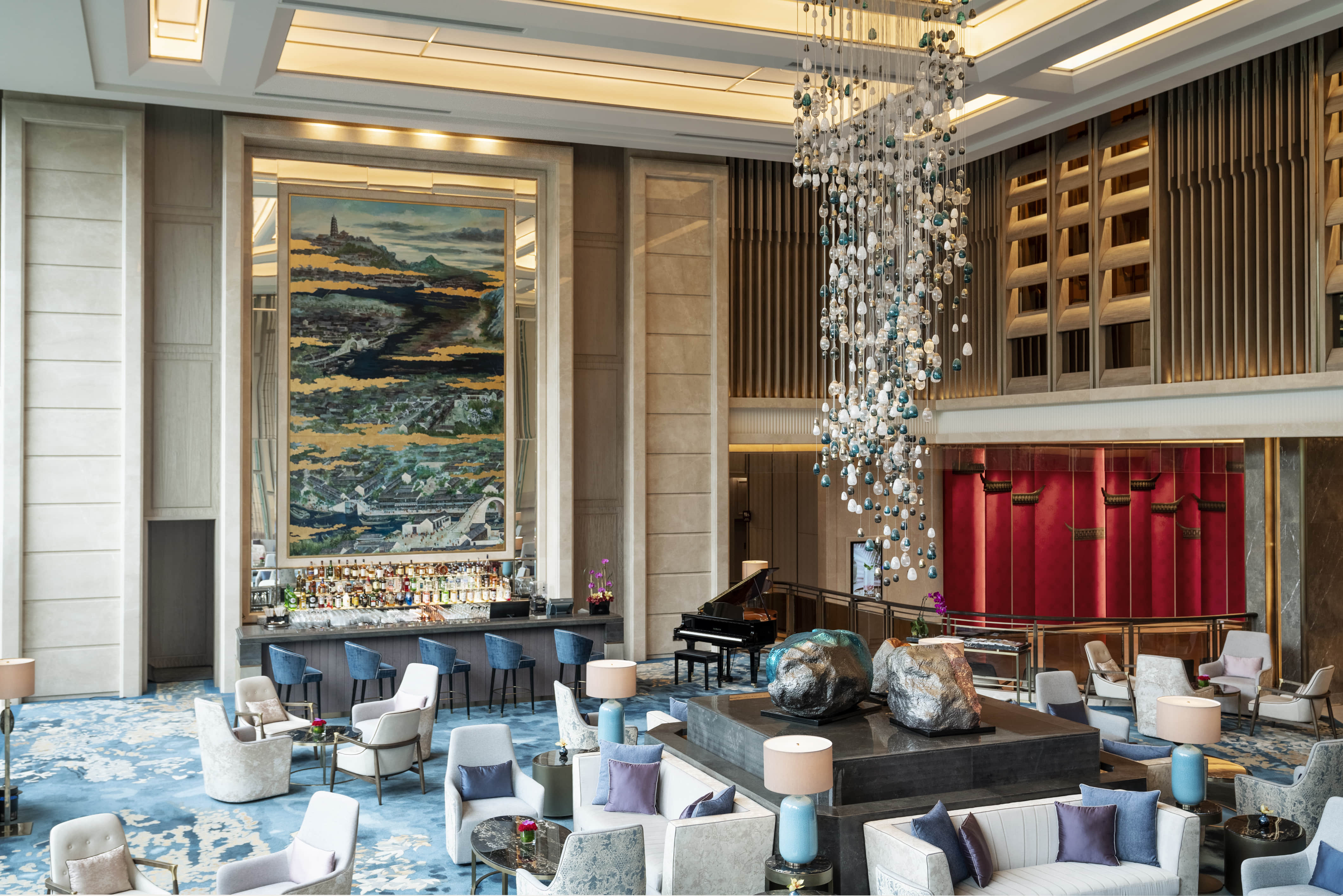 酒店的大堂与宴会入口分开,并以一个走廊连接两端。连廊以红色丝绸与黛瓦组成。整个酒店中苏州园林的意象被使用了多次。设计师把这些元素藏进了大堂的墙面上与以太湖石制成的装饰品中。