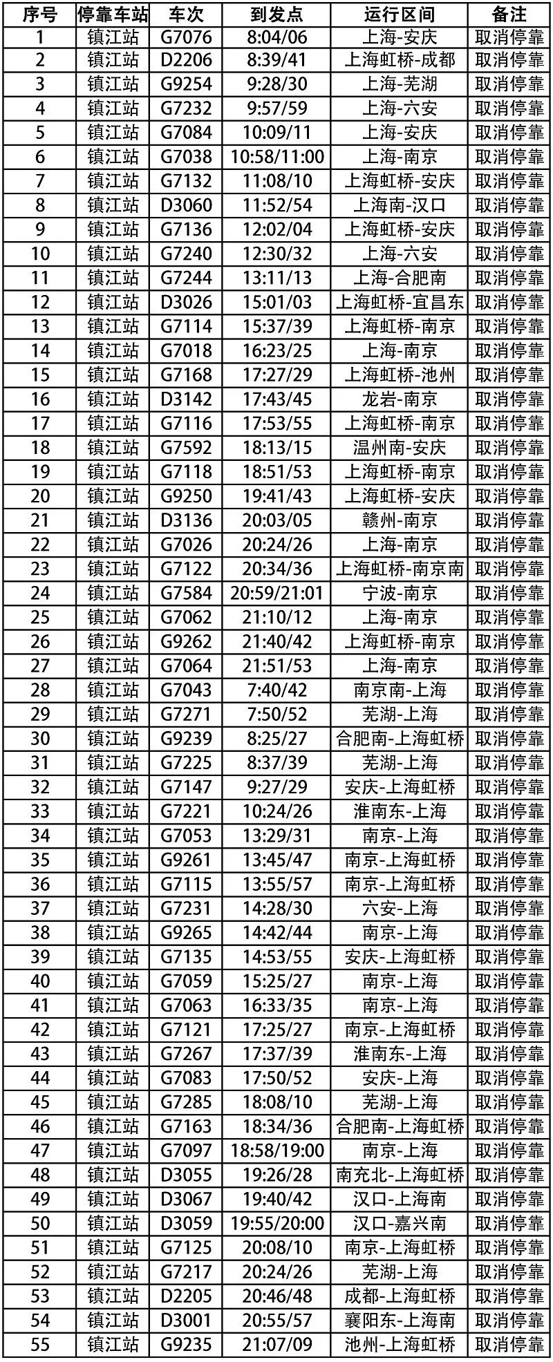 2. 自9月1日起,55趟动车组列车取消镇江站办理客运业务