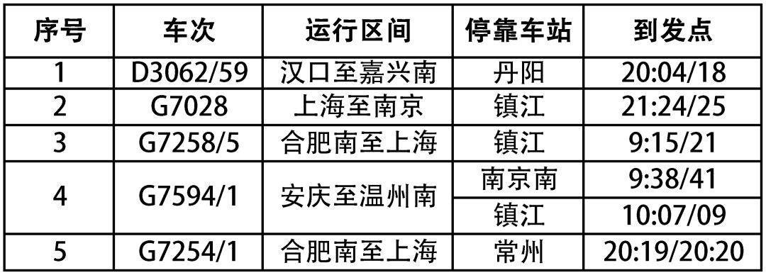 1. 自9月1日起,上海虹桥至成都东D352/3次增加丹阳站(7:39/7:41)办理客运业务,同时镇江站改为7:53/7:55、南京南站改为8:25/8:30。