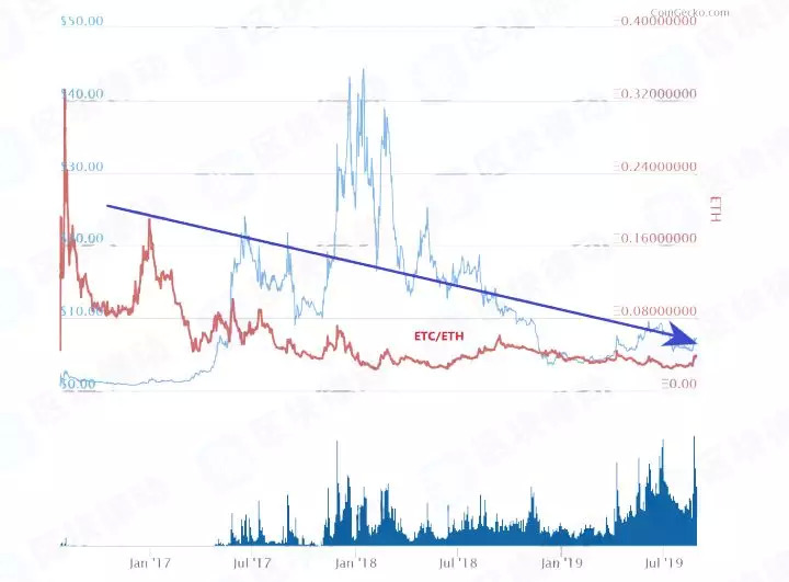 然而,让许多 ETC 支持者意外的是,在 ERC20 代币大行其道的 2017 年,他们眼中的分叉币 ETH 风光无限,ETC 却没有太出彩的东西,ETC 对 ETH 的汇率一直在下跌,最大缩水逾 90%。