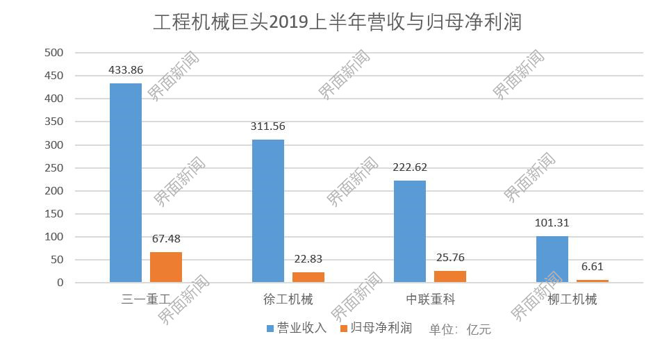 公告显示,上半年三一重工实现营收433.86亿元,同比增长54.27%;归属于上市公司股东的净利润为67.48亿元,同比增长99.14%。