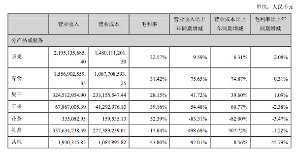 三只松鼠是靠在电商渠道卖坚果起家的创业企业,但这份半年报显示,上半年三只松鼠自营品牌坚果产品营业收入21.95亿元,占主营业务比例48.95%;非坚果品类则获得22.89亿元的营收,占比51.05%。