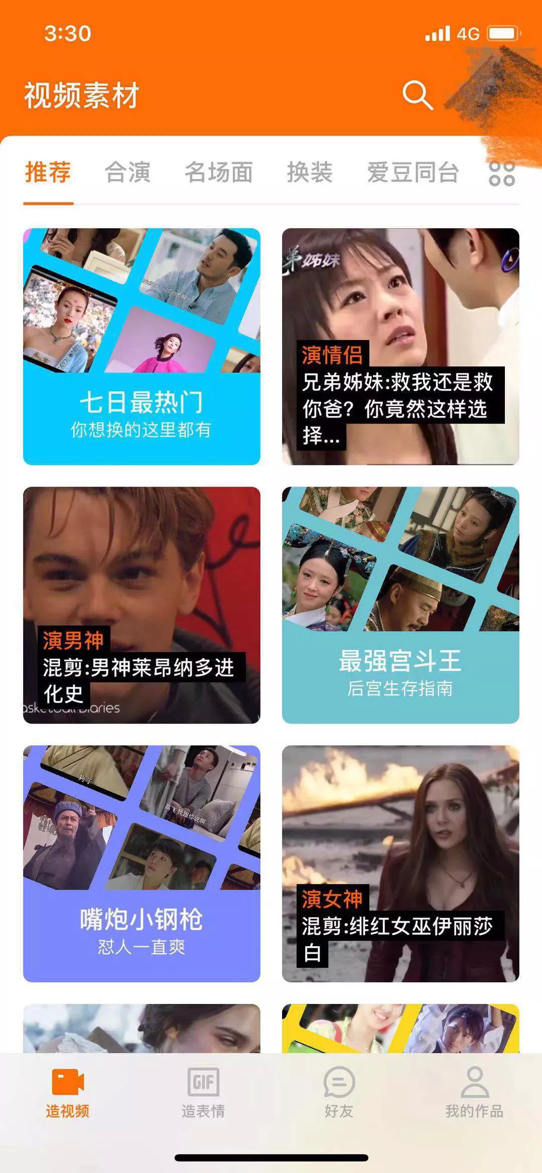该APP主要分为“造视频”“造表情”“好友”“我的作品”四大板块。其中“造视频”板块又由推荐、合演、名场面、换装、爱豆同台组成,进一步点开隐藏弹窗,还可以解锁演、扮演角色、剧情、影剧、演员等分类素材。对于视频中出现的多人角色,用户可以选择任一角色进行替换,替换照片可以即时拍摄,也可以从相册选择。