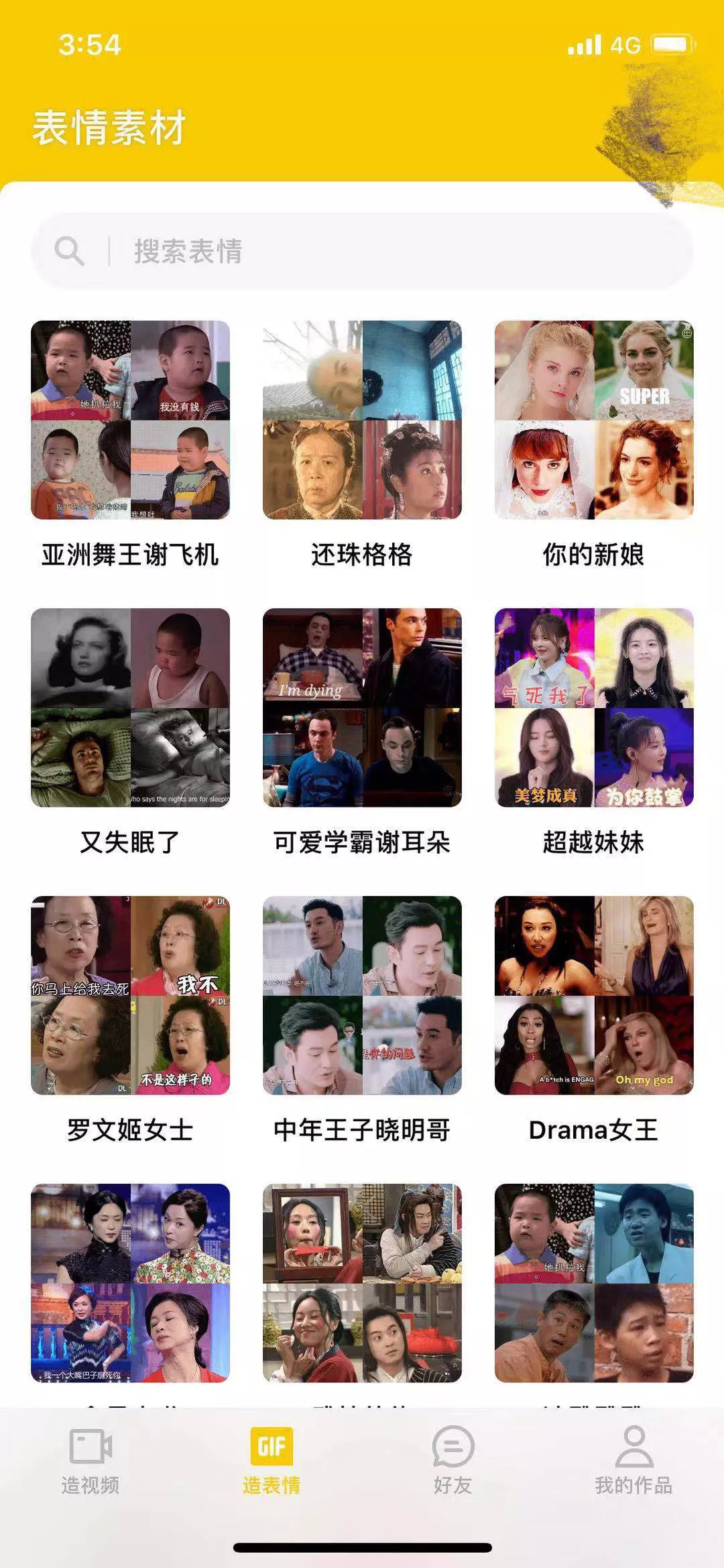 在“造表情“功能里,用户可以将动态表情包中的脸换成自己的,目前可选表情包有亚洲舞王谢飞机、还珠格格、超越妹妹、中年王子黄晓明、甄嬛传等31个分类。