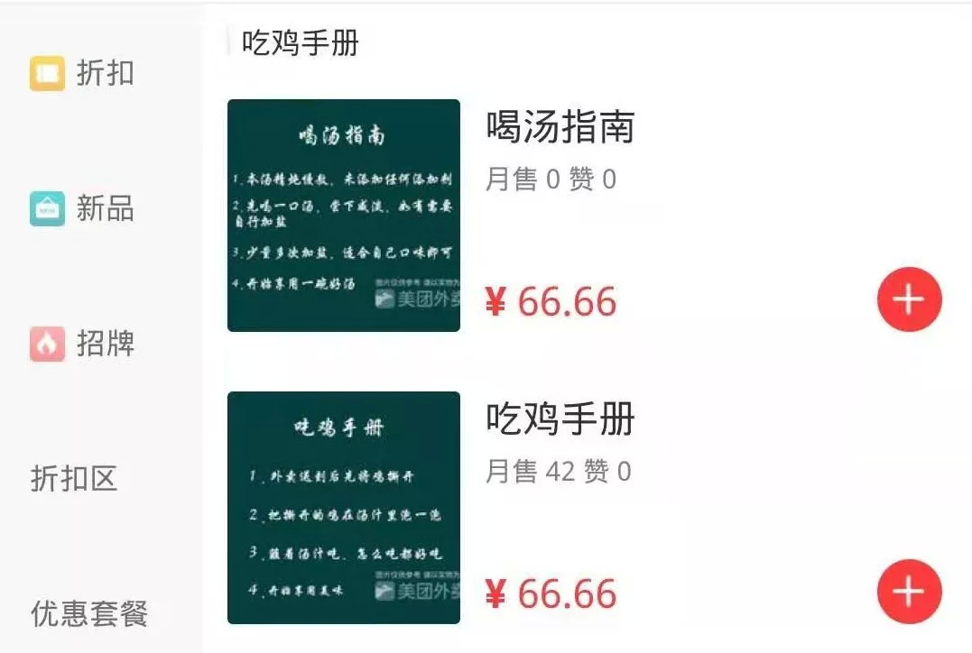 以吃鸡手册为例,第一步:外卖送到后先将鸡撕开;第二步:把撕开的鸡在汤汁里泡一泡;第三步:蘸着汤汁吃,怎么吃都好吃;第四步:开始享用美味;最后附上联系电话。