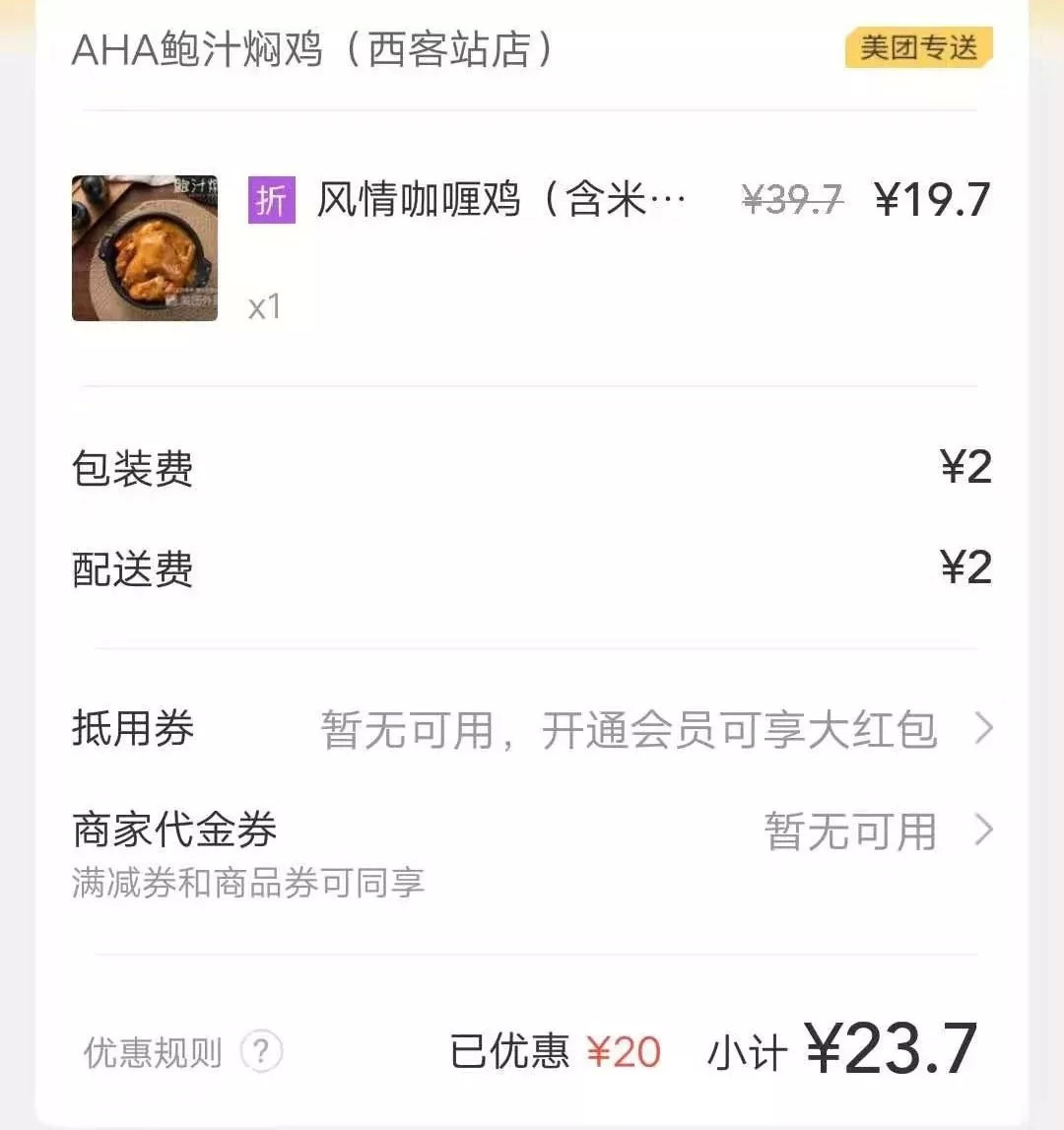 目前,AHA(苏雨)鲍汁焖鸡的折扣产品定价在19.7元,实付达23.7元;对比肯德基一份鸡翅外卖20.5元;黄焖鸡24.4元;价格策略成为AHA(苏雨)鲍汁焖鸡的特色。