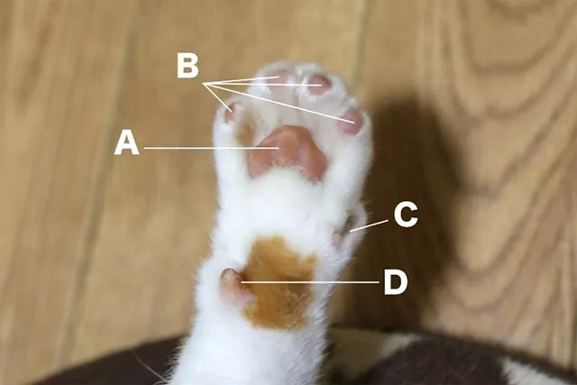 D被称作手根球(footpad),这个肉球只在喵喵的前爪出现