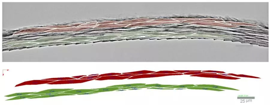 之后,这些纤维被切成均匀的碎片,利用静电力把它们移动到载玻片(一种玻璃片)上,对这些样本的片段进行染色,最后在显微镜下观察。测量出每个纤维的平均曲率,然后放大到曲线上精确点的细胞结构。