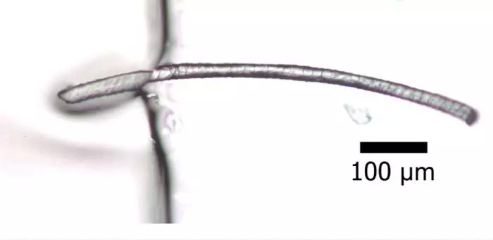 载玻片上的单根羊毛片段 图源:AgResearch Ltd https://www.abc.net.au/cm/lb/9570904/data/microscopic-wool-fibre-data.jpg