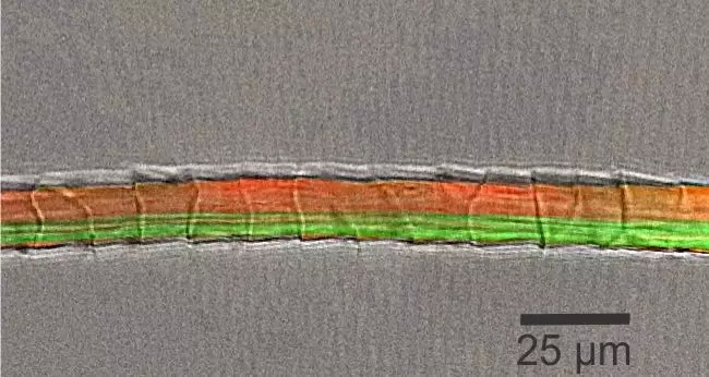 染色显示纤维状的正皮层细胞(橙色)和副皮层细胞(绿色) 图源:AgResearch Ltd https://www.abc.net.au/cm/lb/9568412/data/microscopic-fibre-data.jpg