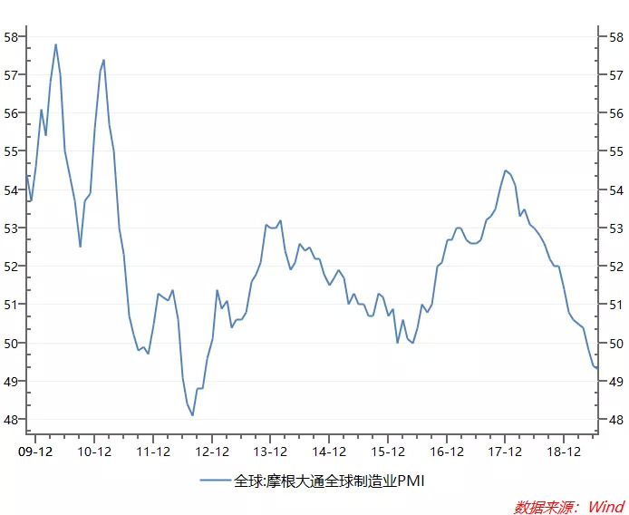 摩根大通全球制造业PMI指数连续低于50荣枯线,并跌破了2016年低位(2016年全球债市收益率创出历史新低)。