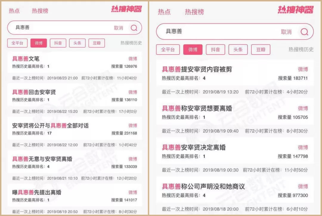 具惠善和安宰贤离婚一事被爆出后,在微博上引起了网友的持续关注,从18日早上消息传出到23日,六天内与两人离婚相关词条上了12次热搜,其中五次热度最高时位列热搜榜第一名。