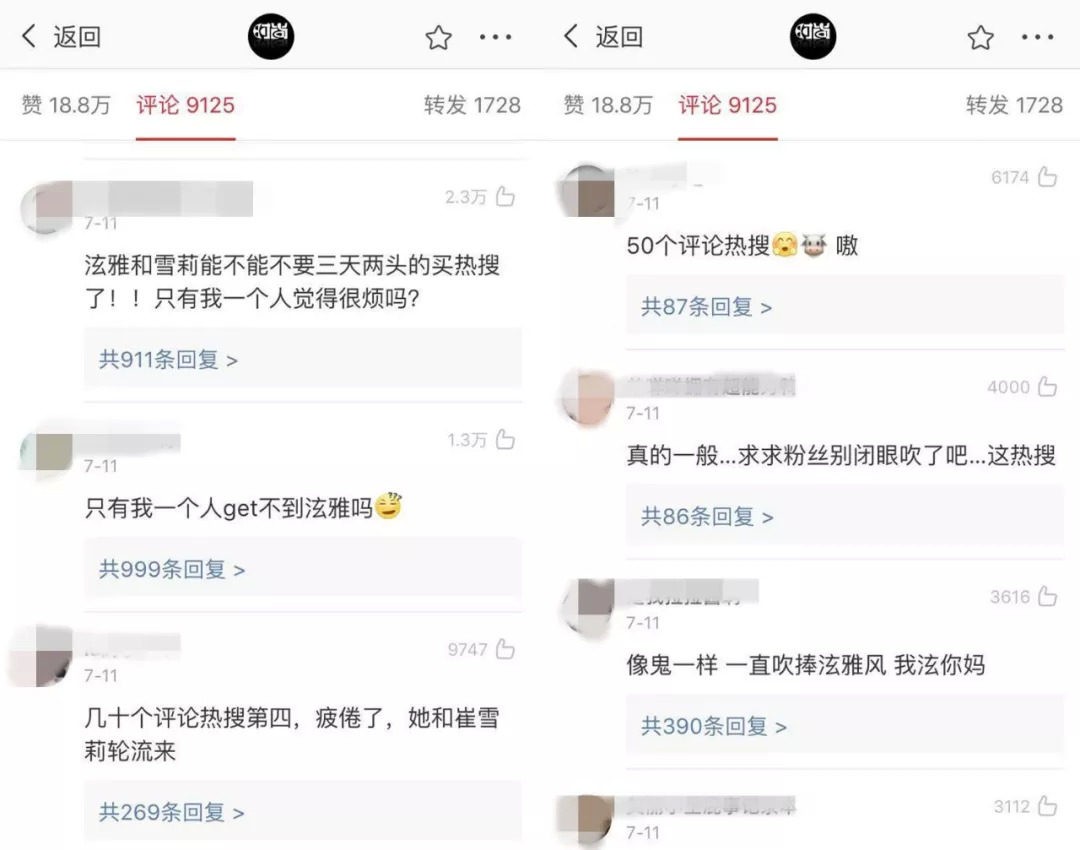 另一位热搜常客崔雪莉今年以来则上了22次热搜,最近的一条热搜为“雪莉IU同框”,其中热度最高的微博下也有评论称,“能不能别买热搜了?烦不烦?凭实力不好吗”。