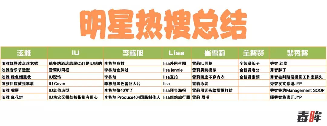 根据营销人员告诉的方式,毒眸搜索了一系列在国内较有知名度的韩星自2018年以来的热搜词条发现,除明星结婚、离婚、涉嫌吸毒等大事件外,热搜词条多为“名字+妆容/服饰/形容词”,在格式上符合营销套路。