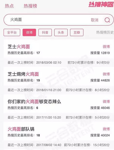 火鸡面登上热搜次数