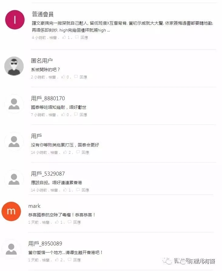 谭文豪俨然把自己当“国泰风暴”的最大主角,还把辞职说成是去“守护自由”,简直可笑。实际上,其和此前被解雇的两名飞行员根本别无二致。在网友的众多留言中,可以看到香港市民对谭文豪是多么的厌恶和鄙视: