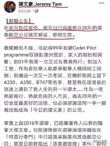 21日,其在Facebook上贴出辞职公告,称自己已向国泰航空公司辞职,实时生效。并附上了电影对白般的台词,声称因为不忍看到公司被攻击和“施压”,所以他决定辞职。还称希望可以以此“保护”国泰,“让航空界的风暴到我这里停止”,谭文豪随后更大放厥词,称自己会继续“守护自由”。